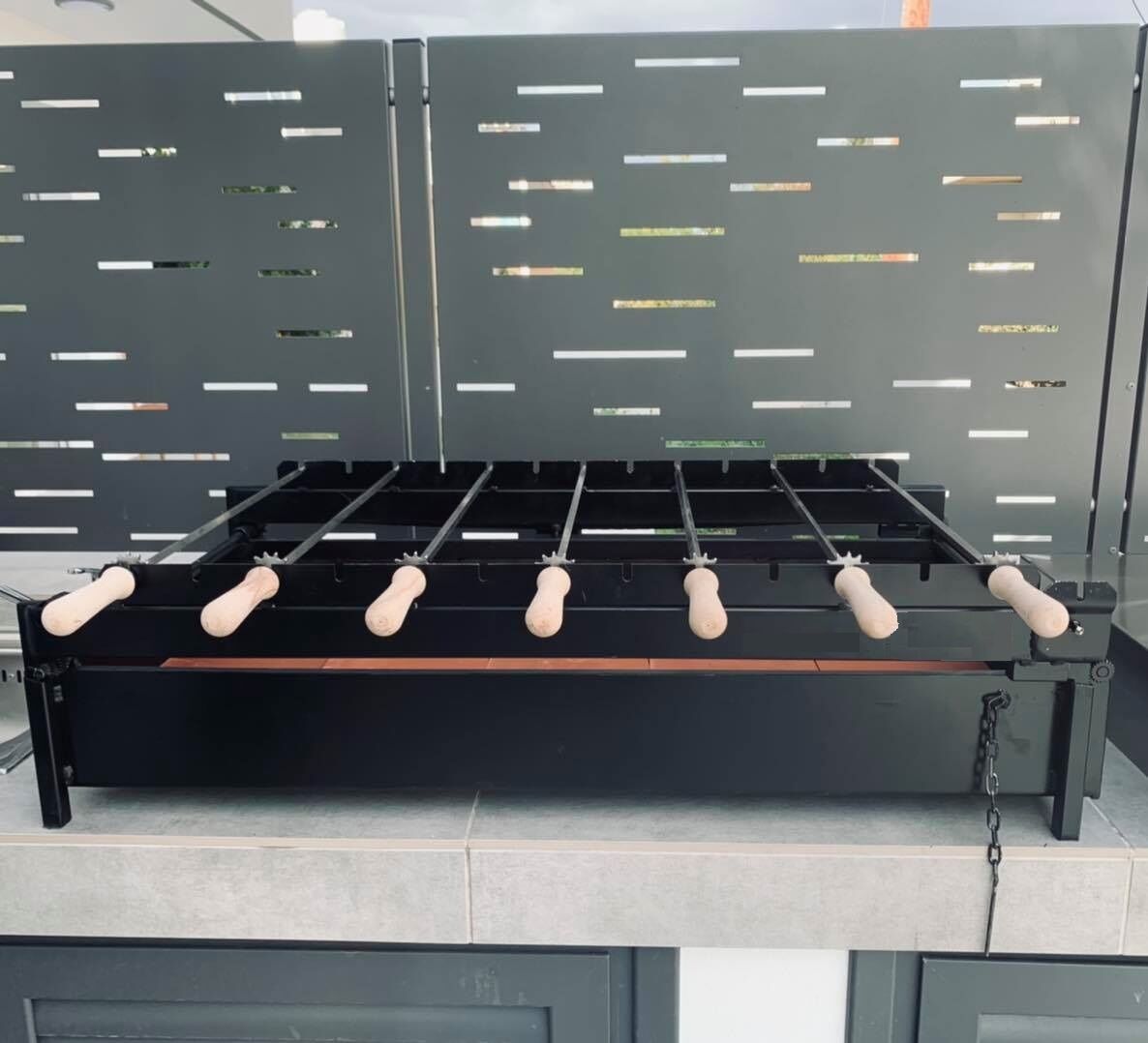 This Cyprus grill chain drive includes a very powerful and efficient chain driven mechanism for up to 13 spits. The mechanism operates silent and efficient and can be installed into or on top of the bench. The Motor (Not Included by Default) is inserted on the same side as spits and skewers. This saves space. The capacity can be estimated to 15-20 Kg of meat. Length of the chain drive mechanism: 85 cm. Distance skewer to skewer: 55 mm. When it comes to built in chain drive charcoal grills you won't get a better value than the CG-9000, with it's huge charcoal cooking area of 4560 cm2 95cm x 48cm. Height adjustable to give you different cooking positions that allow optimal performance.