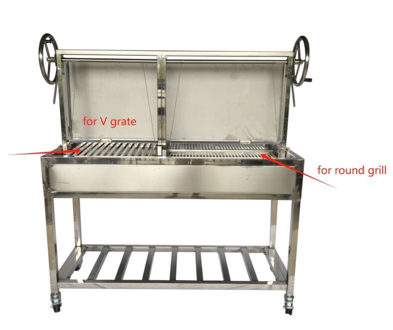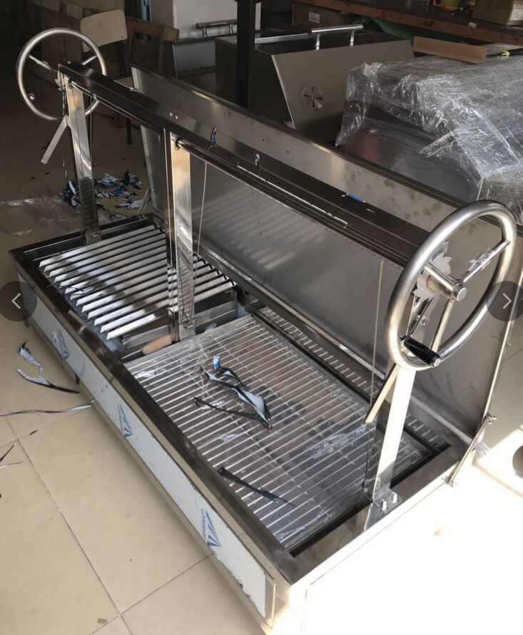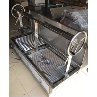 The Argentinian BBQ is a commercial charcoal BBQ in stainless steel which offers the ability to adjust the cooking height using the wheel on the right. To lift the height, the wheel turns clockwise. In order to drop the height, the pin must be released. This allows you to control your cooking based on the amount of heat the charcoal is producing. The cooking area oferred is quite large. The stainless steel grills are very heavy duty. These grills are quickly removable for easy cleaning. Inside the base are 2 black heavy duty charcoal troughs, allowing you to have the option of using half the barbecue at any given time. Imagine the taste of a butterflied suckling pig, some asado or even a large turkey. This Argentinian BBQ would be perfect for anything you want to flame grill.