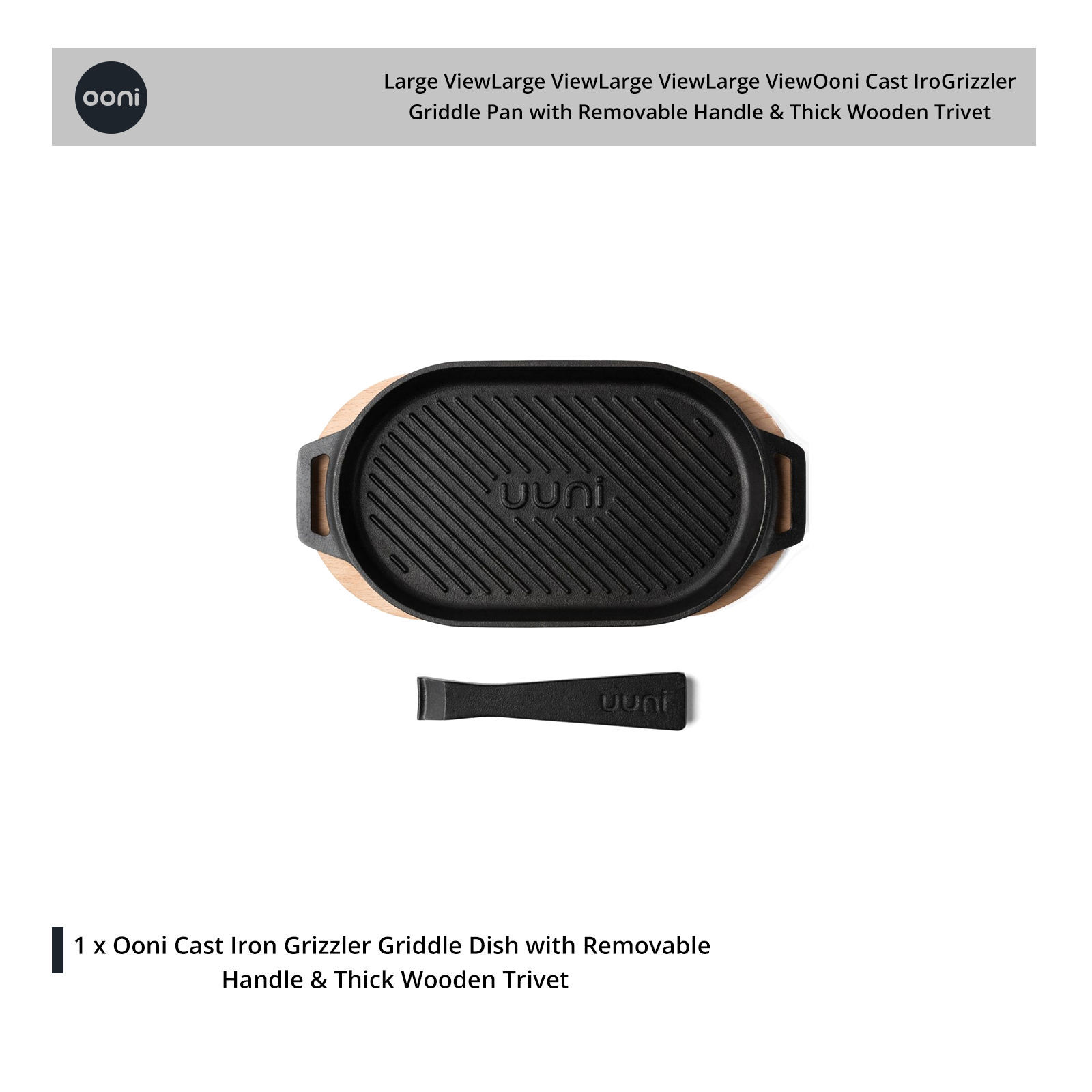1 x Ooni Cast Iron Grizzler Griddle Pan with Removable Handle & Thick Wooden Trivet - UU-P08D00