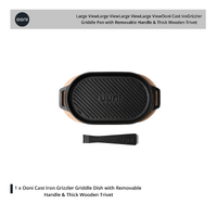 The Ooni cast iron grizzler pan with removable handle and thick wooden trivet is an excellent addition to the list of different ways to cook in your Ooni pizza oven. Ideal for searing thick cuts of meat or speedy cooking of hearty chunks of vegetables, seafood or poultry, the thick wooden board included protects your patio table when you are ready to serve your cooked meal. The cast iron handle is uniquely designed to help you safely transfer your sizzler dish in and out of the oven without burning your hands.