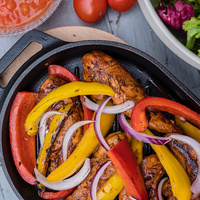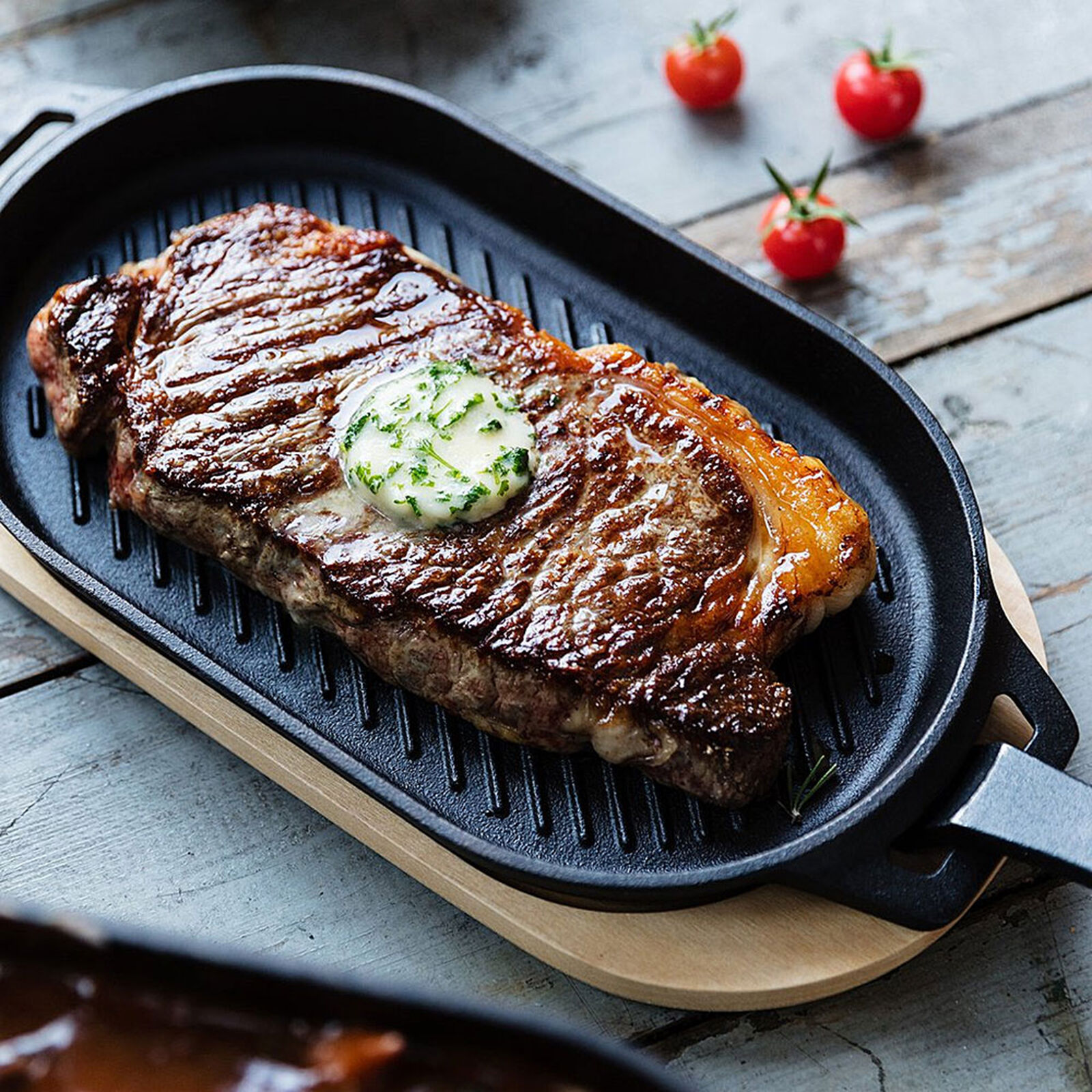 Functional design: Cast iron grizzler sizzling dish with raised ridges that make it deal for searing thick cuts of meats or roasting vegetables